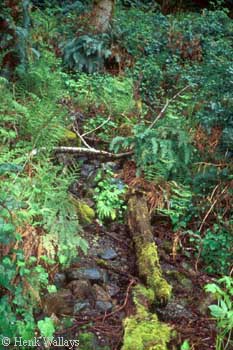 As we went up to Northern Oregon, we intended to look for more Rhyacotriton populations. With this idea in mind, we stopped both at Cape Ferrello, Oregon and Humbug Mountain. On a northern exposed slope, under the canopy of a primary coniferous wood, we found a small stream searching its way down. The sides were filled with large moss-covered stones and fallen logs of redwood trees. We knew that we were again in Rhyacotriton land and started searching again along the sides of the stream. Hiding in these side pockets, we found some adult Rhyacotriton variegatus. Again, the larger larval Dicamptodon tenebrosus (>10 cm) were lying under stones hidden in the stream. They would certainly not refuse a healthy Rhyacotriton menu. The coloration of the adult Rhyacotriton differed considerably from the Californian animals: they had a less dark color.