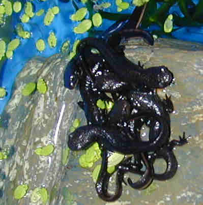 ![]() Larvae of some species, such as these Cynops pyrrhogaster, can be sucessfully raised in the same tank with adults. |