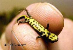 A Cynops orientalis juvenile that has been raised on whiteworms, which lack carotene.