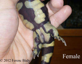 Fire salamanders (Salamandra salamandra). The general rule about the cloaca holds true. The sex should be distinguishable after they reach about 6 inches (15 cm) in length.