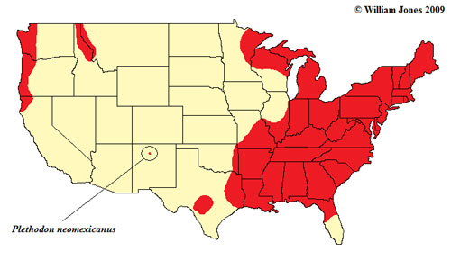 Range map for the genus Plethodon in the USA. P. neomexicanus is very much isolated from all other species in its genus.