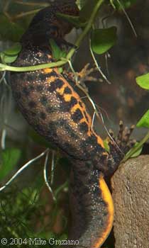 Metamorphosis takes place within 8-16 weeks, depending on food supply and temperature, at a size of 5-8 cm (2-3 inches). Metamorphs should be allowed to leave the water at least partially, in order to prevent drowning. If it is desired to raise them aquatically, it is usually sufficient to keep them in a predominantly aquatic setup, and feed in the water - they will grow used to staying in the water. They can, of course, live terrestrially, as they would in nature. Feeding and housing is essentially identical to that of the adults, though smaller food must obviously be provided. Young newts can eat very large quantities of food, and if fed sufficiently, may grow to adult size in one year. Two years is a more common time to reach adult size in captivity.